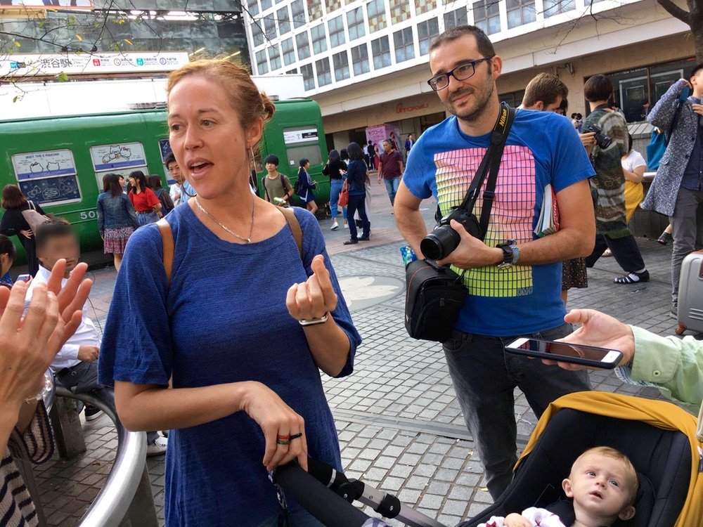 今回は私にとっては2度目の日本ですが、夫と息子は初来日です。2日前に日本に来ました。渋谷に来たのは巨大な交差点を見るためで、この後原宿の竹下通りでコスプレの人たちを見たり、代々木公園近くの神社(*おそらく明治神宮)に行きます。