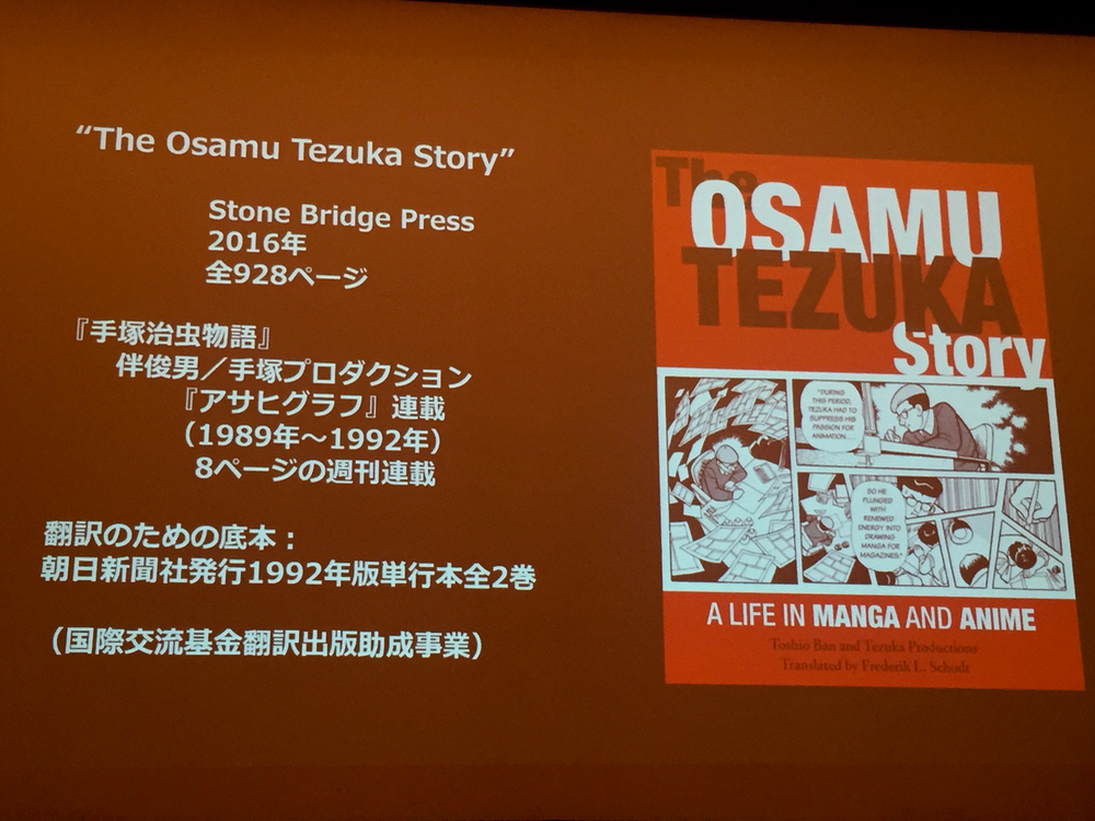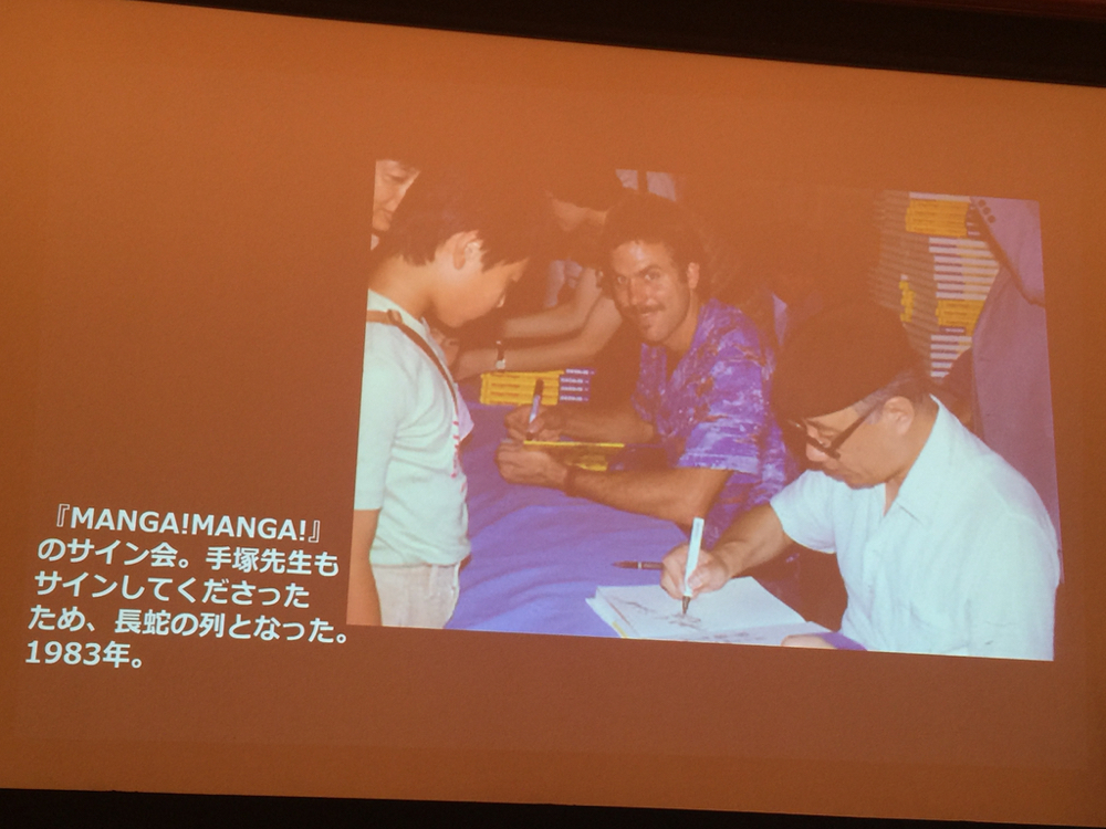 右のスライドにあるサイン会の時、ショット氏の著書である”Manga! Manga! The World of Japanese Comics”に氏と手塚からサインをいただいたという人が、今年(2017年)2月に国際交流基金で行われたショット氏の講演会に、その本を持参。約35年ぶりの再会となりました。