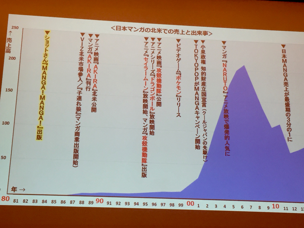 氏の言った“時期尚早”という言葉を裏付ける資料として、モデレーターの椎名氏が“日本マンガの北米での売上高”を示すグラフを映しました。