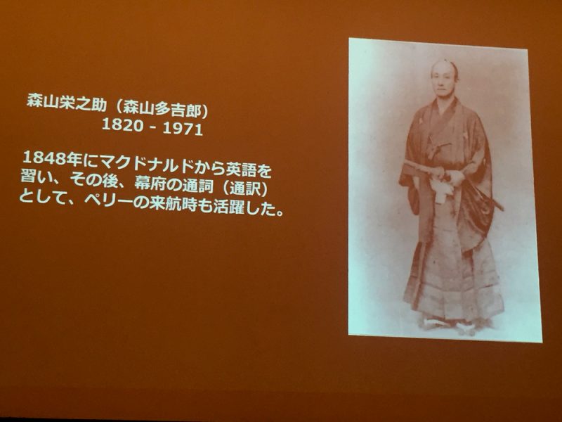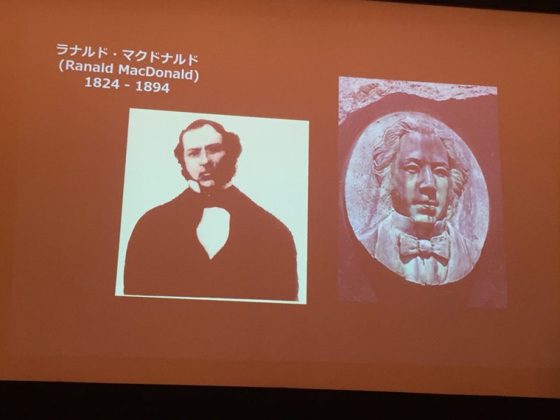 他にもショット氏が行った、アメリカ人冒険家のラナルド・マクドナルドと、幕末の日本人武士・森山栄之助との交流の研究についても語られました。マクドナルドはヨーロッパ系と先住民との混血だったため、その研究成果は” Native American in the Land of the Shogun: Ranald MacDonald and the Opening of Japan”というタイトルの本に収められました。