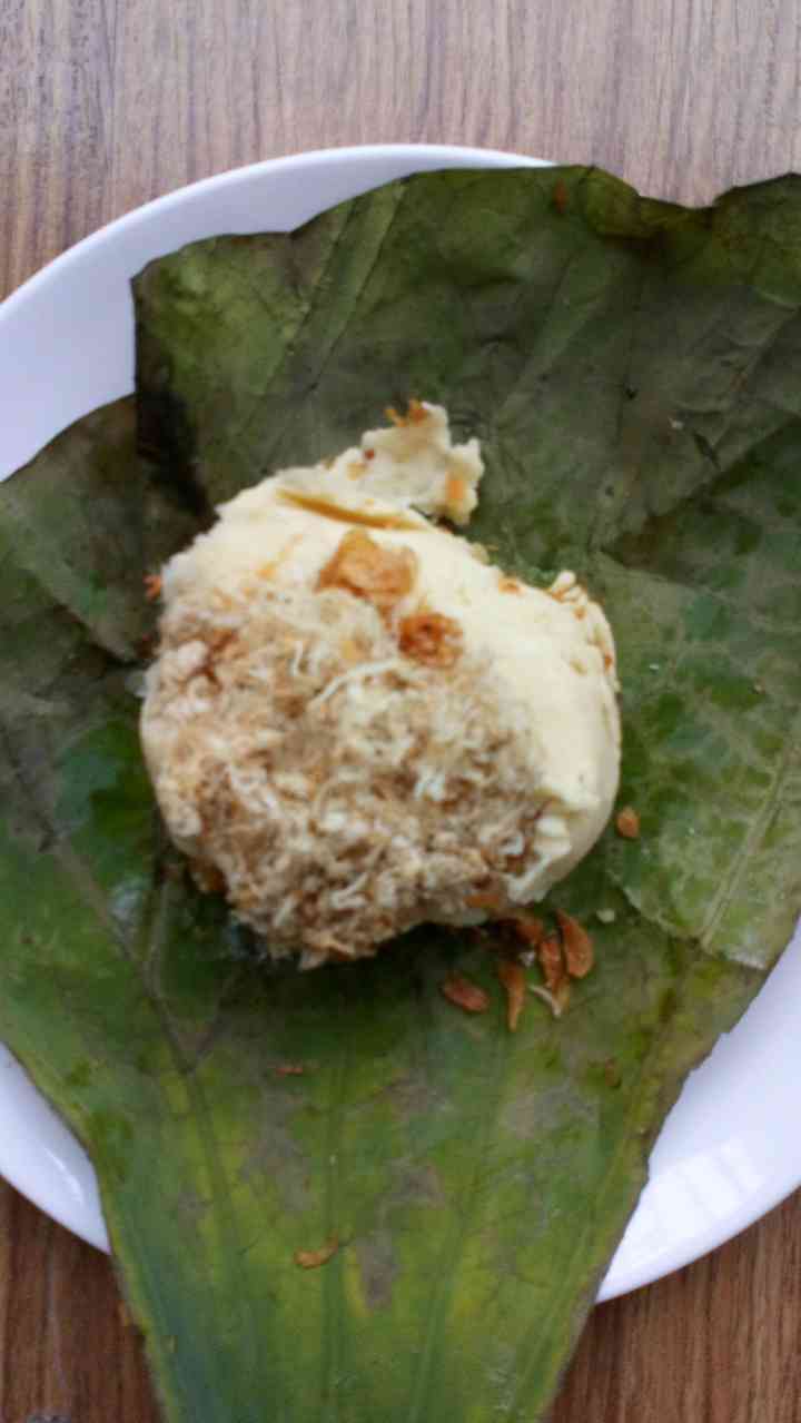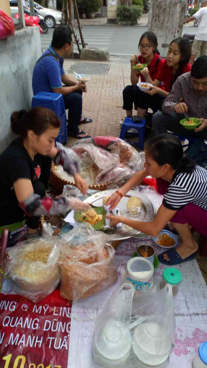 街のあちこちに朝だけ「おこわ」の店が現れ、プラスチックの小さい椅子に座って食べます。このお店では、蓮の実の入った「おこわ」に、マッシュされた緑豆のペーストをスライスして、フライドオニオンを乗せて食べていました。テイクアウトの場合は、蓮の葉でくるんでくれて10,000VND(編集者注:約50円)でしたが、とても美味しかったです。