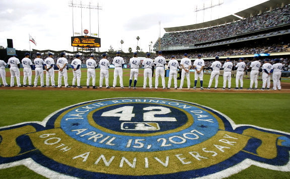 「黒人選手として初めて米大リーグでプレーしたジャッキー・ロビンソンがデビューを飾ったのが、1947年の4月15日。故人の功績をたたえ、この日は”ジャッキー・ロビンソン・デー”と銘打って行われた。激しい人種差別と戦ったロビンソンがデビューした”4・15”は、2004年から記念日に制定されている。故人が現役時代に背負い、全球団で永久欠番となっている背番号”42”のユニホームを、今年も監督、選手らが着用してプレーした」