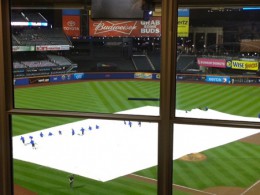 多くのメジャーの球場は屋外球場なので、天候にとーーっても左右されるんです。もう笑っちゃうくらいのひどい大雨。さっきまで凄く天気が良かったのに、この変わりよう・・・本当にメジャーはお天気の神様のご機嫌に左右されますね~