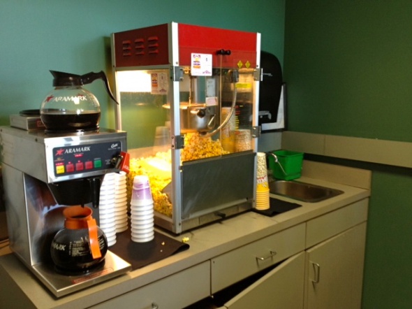 ボストン・レッドソックスの球場はプレスボックスに、ポップコーンとドリンクマシーンが置いてあり、無料です!\(*T▽T*)/ワーイ♪