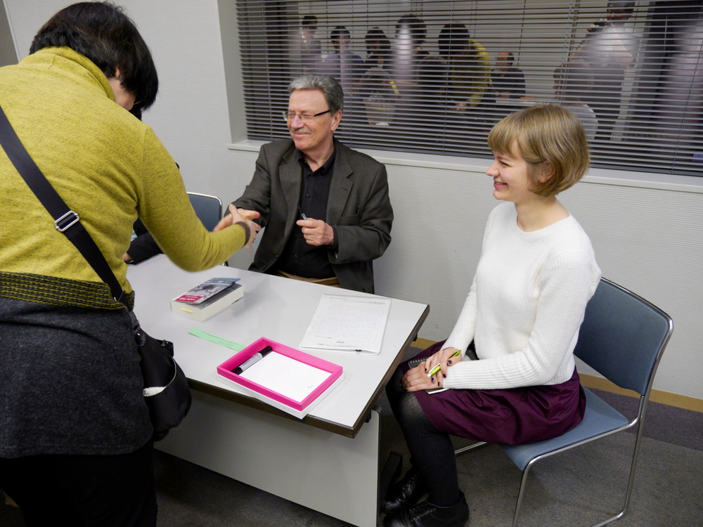 ドイツ人児童文学作家クラウス・コルドン氏来日時の通訳の様子。ドイツ文学翻訳家の酒寄進一氏(上の写真左側)とコルドン氏の対談をマライさんが通訳し、その後のサイン会ではコルドン氏と日本人ファンとの会話を通訳。