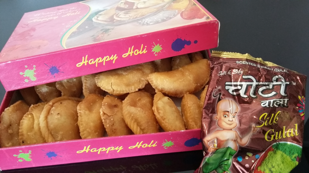 上の写真の箱に入っているおやつ、その名も「グジヤ(Gujiya)」。実際には春の到来を祝う「ホーリー祭」の時期に食べるものです。大気汚染と冷え込みの厳しい冬を越え、3月の時点ですでに気温は30度超!もはや夏とも呼ぶべき春の日に、世界一カラフルで過激と言われるお祭りが行われました。今年は3月24日でした。