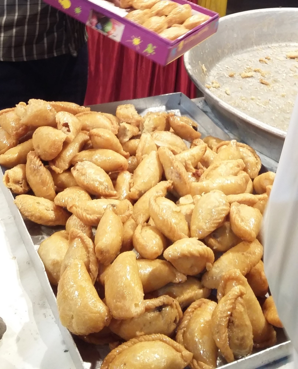 ホーリーの時期だけ食べられることもあって、街のお菓子屋さん前にはグジヤ特設スペースができ、飛ぶように売れます。
