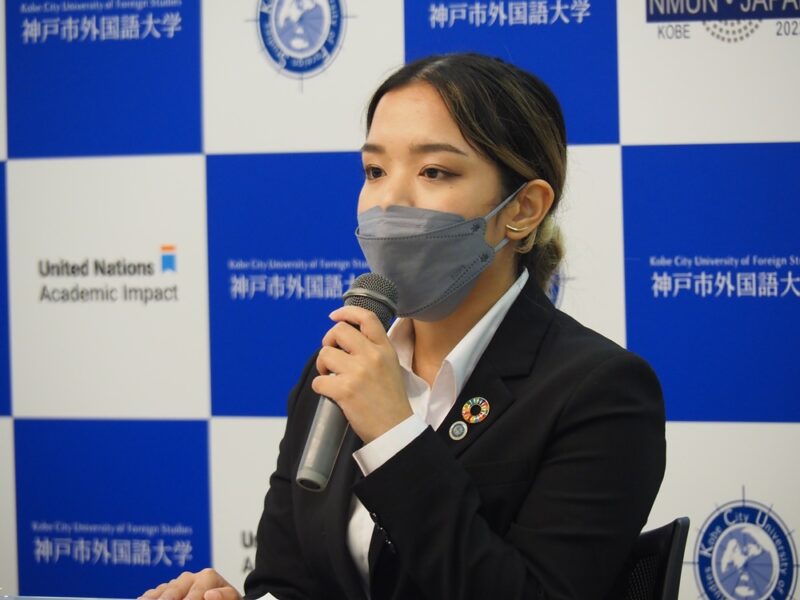 本大会開催に向けて開かれた記者会見で、模擬国連の事務総長を務めるヒキタ・キーシャ・ロレーヌ・サントーヨさん(本学4年)が、大会に込めた学生たちの思いを語りました。